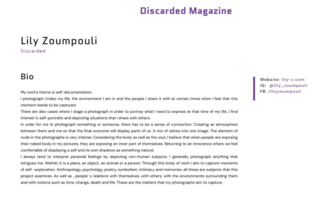 My Work Published By Discarded Magazine 2020 https://www.discardedmagazine.com/portfolio/lily-zoumpouli/?fbclid=IwAR1kbYyGV94GimCb9QeCSDoFJ8Vy4Q3e_PNrTpjvrW_5C_ZNI5-CojF1Crw Share this: Click to share on X (Opens in new window) X Click to share on Facebook (Opens in new window) Facebook