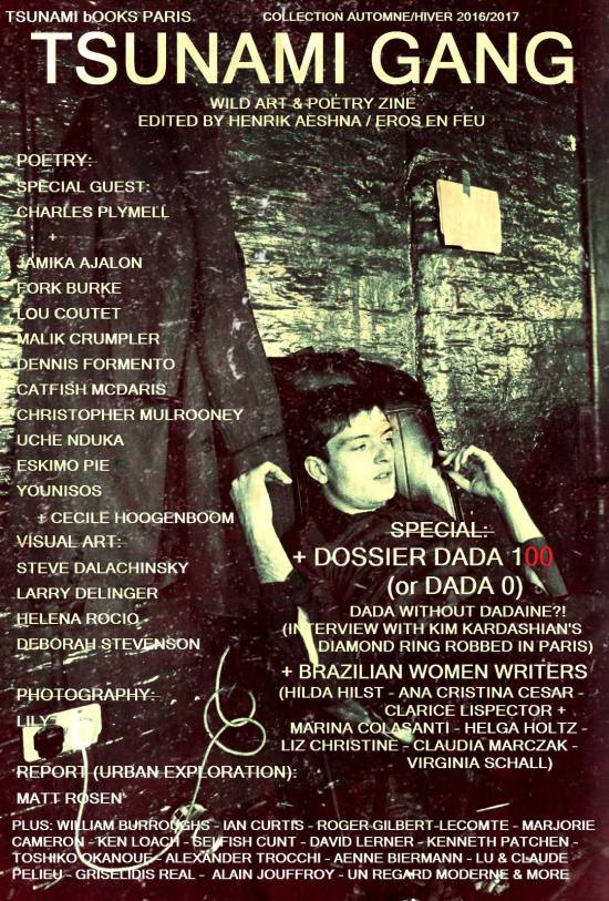 Tsunami Books Paris TSUNAMI GANG 2016/2017 IS OUT! http://tsunamibooks.jimdo.com/2016/11/24/tsunami-gang-2016-2017-issue-wild-art-poetry-zine-tsunami-books-paris/ Thanks to all the artists & friends – Enjoy! + DOSSIER DADA + a selection of Brazilian women poets & Erotica: Hilda Hilst, Ana Cristina Cesar, Clarice Lispector & more —- POETRY: Charles Plymell (Pam Plymell), Jamika Ajalon, Fork Burke, Lou Coutet, Malik Crumpler, Dennis FOrmento, […]